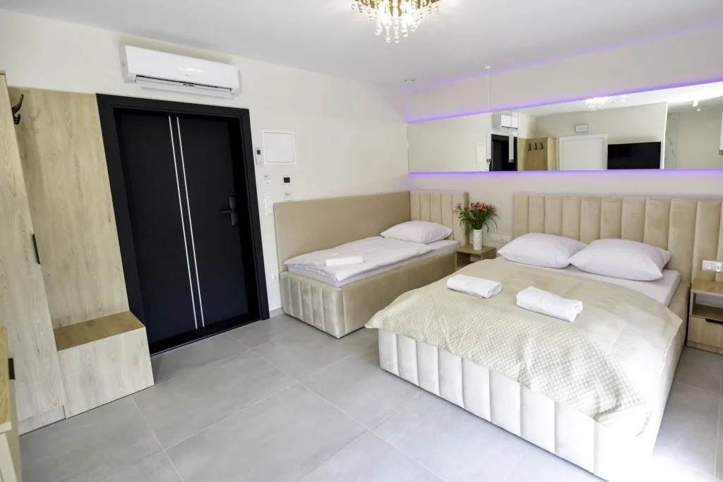 Każdy apartament wyposażony jest w klimatyzator. Do dyspozycji Gości jest internet światłowodowy. Goście apartamentów mają również dostęp do znajdującego się na terenie domków jacuzzi, basenu z podgrzewaną wodą, boiska, parkingu oraz rowerów. Dzieci mogą bawić się na z placach zabaw, korzystać z rowerów, hulajnóg i jeździków. Cały obszar, na którym znajduje się kompleks domków i nasz nowy apartamentowiec jest monitorowany i ogrodzony, aby goście czuli się u nas bezpiecznie.