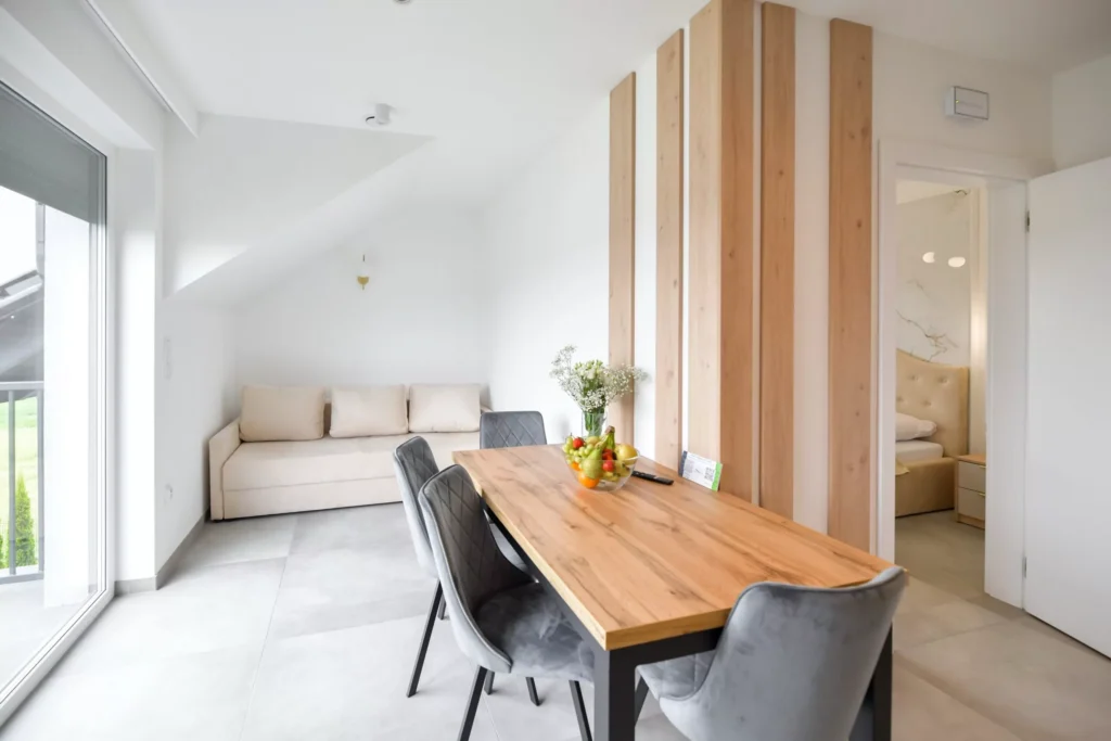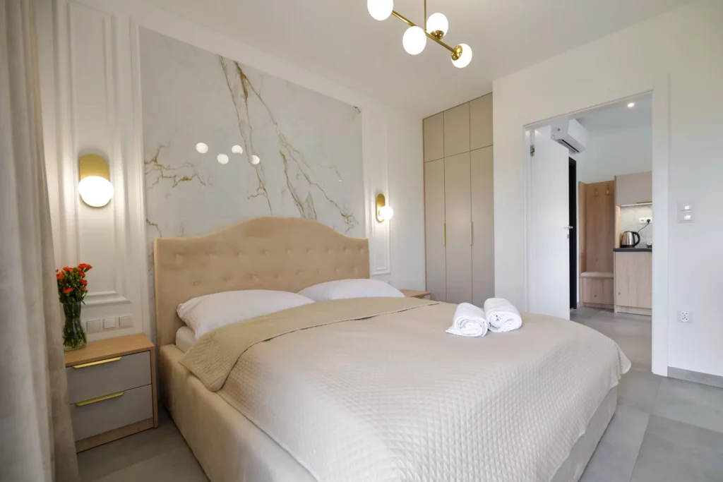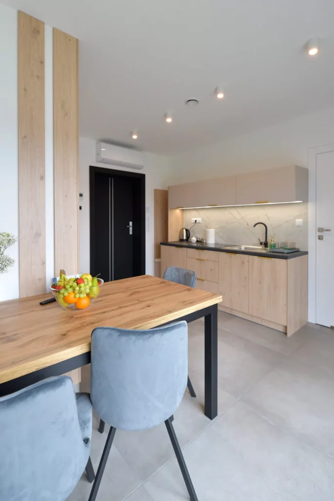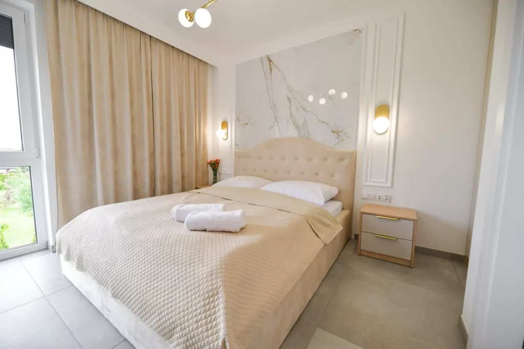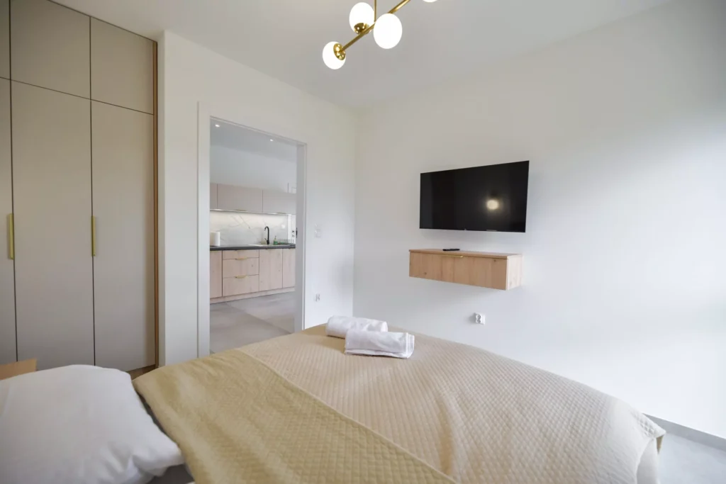 Każdy apartament wyposażony jest w klimatyzator. Do dyspozycji Gości jest internet światłowodowy. Goście apartamentów mają również dostęp do znajdującego się na terenie domków jacuzzi, basenu z podgrzewaną wodą, boiska, parkingu oraz rowerów. Dzieci mogą bawić się na z placach zabaw, korzystać z rowerów, hulajnóg i jeździków. Cały obszar, na którym znajduje się kompleks domków i nasz nowy apartamentowiec jest monitorowany i ogrodzony, aby goście czuli się u nas bezpiecznie.